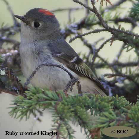 The Ruby-crowned Kinglet is a small green-coloured bird, which is usually found in conifers. It breeds in the boreal forest and the tundra. The male has a red stripe through the center of its crown. The red stripe is often times very hard to see, unless it raises the feathers on the crest of its head. The female does not have the red on the top of her head. These small kinglets have been reported seen on Cuba.